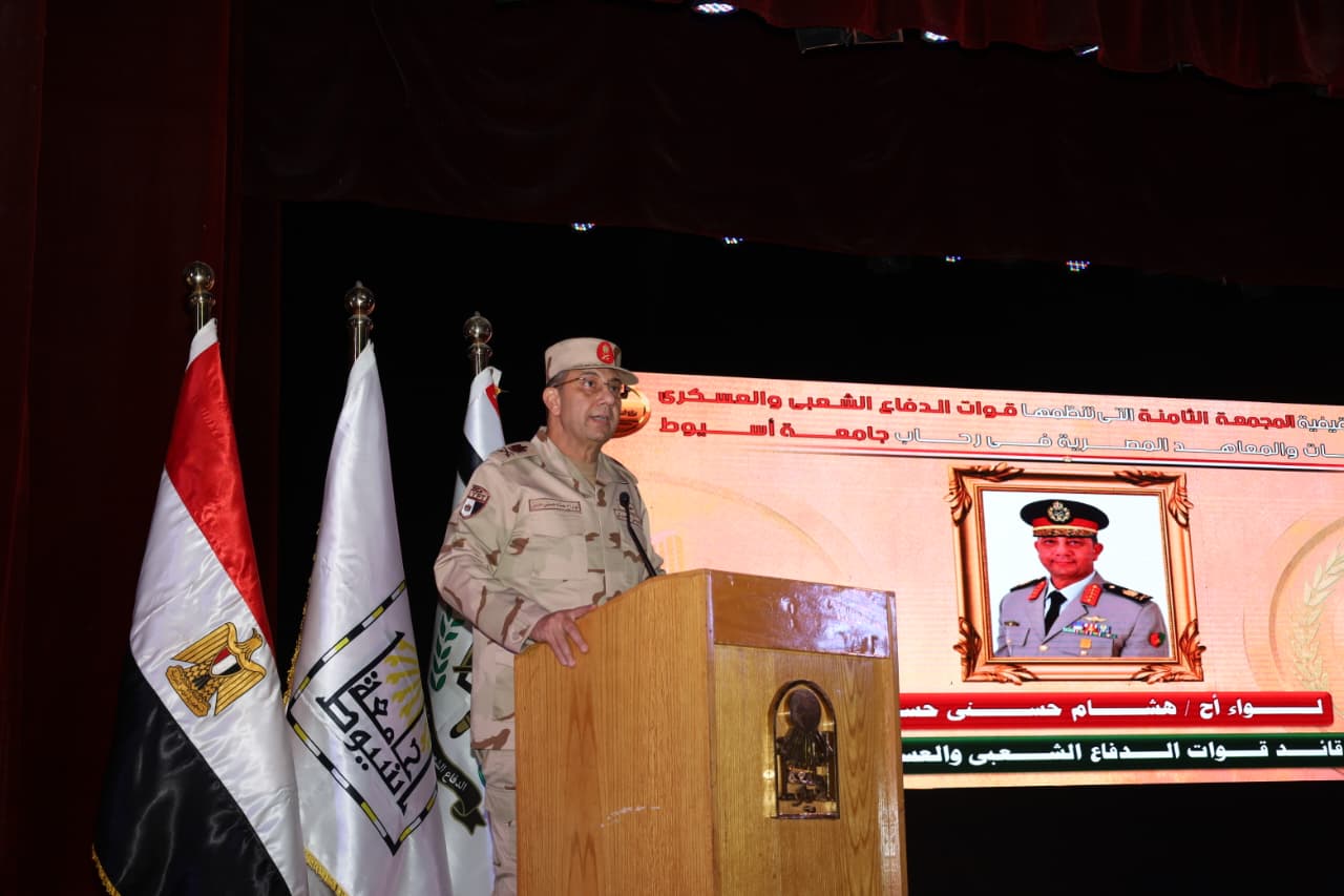 ومن جانبه، نقل اللواء أركان حرب هشام حسني حسن أحمد، قائد قوات الدفاع الشعبي والعسكري، تحيات الفريق أول عبد المجيد صقر، القائد العام للقوات المسلحة وزير الدفاع والإنتاج الحربي، والفريق أحمد خليفة، رئيس أركان حرب القوات المسلحة، معربًا عن اعتزازه بتواجده وسط طلاب الجامعات المصرية، الذين يمثلون الأمل الحقيقي والمستقبل الواعد للدولة المصرية.