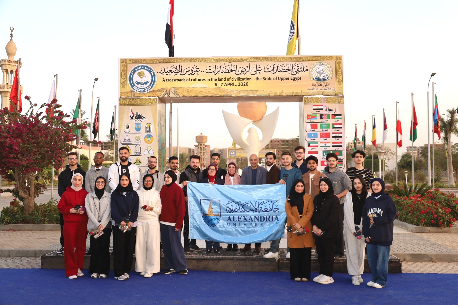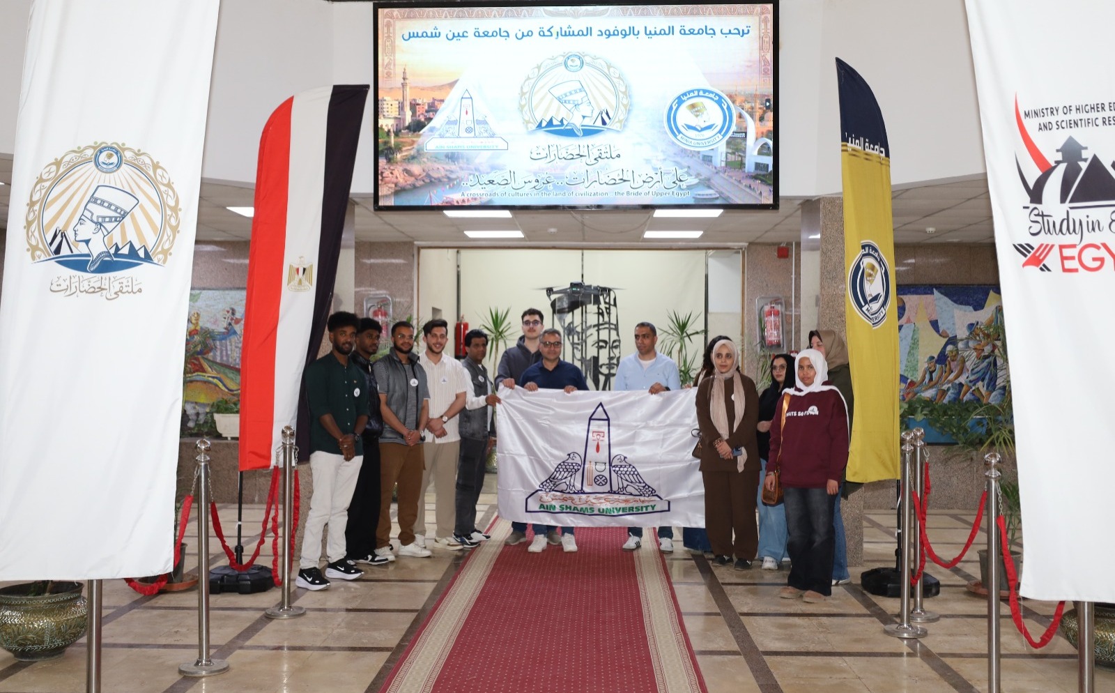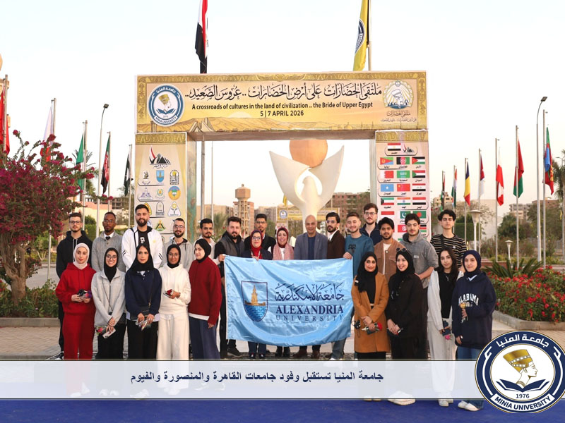 جامعة المنيا تستقبل وفود جامعات عين شمس وبور سعيد والمنوفية والإسكندرية من الطلاب الوافدين المشاركين بملتقى الحضارات حيث ضمت وفود الجامعات 14 جنسية مختلفة من دول العالم