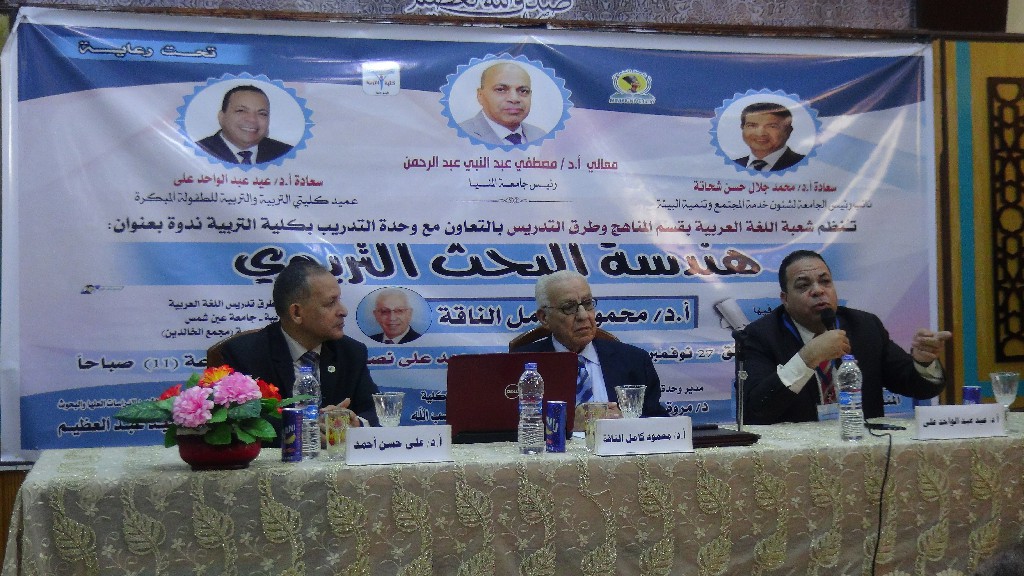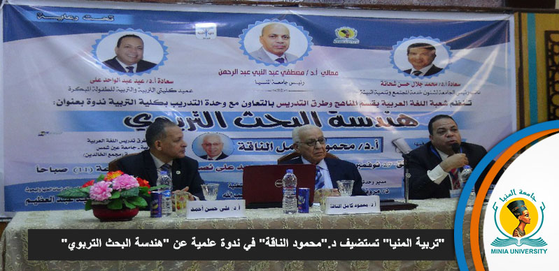 أستضافت شعبة اللغة العربية بقسم المناهج وطرق التدريس بالتعاون مع وحدة التدريب بكلية التربية جامعة المنيا، الدكتور محمود كامل الناقة أستاذ المناهج وطرق التدريس بكلية التربية جامعة عين شمس ووكيل الكلية للدراسات العليا والبحوث، في ندوة علمية عن "هندسة البحث التربوي"، تحت رعاية الدكتور مصطفى عبد النبي عبد الرحمن رئيس جامعة المنيا، والدكتور محمد جلال حسن نائب رئيس الجامعة لشئون خدمة المجتمع وتنمية البيئة، والدكتور عيد عبد الواحد عميد كلية التربية، بهدف توعية طلاب الدراسات العليا وأعضاء هيئة التدريس بالأخطاء الشائعة في كتابة البحث التربوي، وفنياته، والكتابة الصحيحة له وخطواته بأكثر الأساليب والطرق كفاءة وفعاليّة.