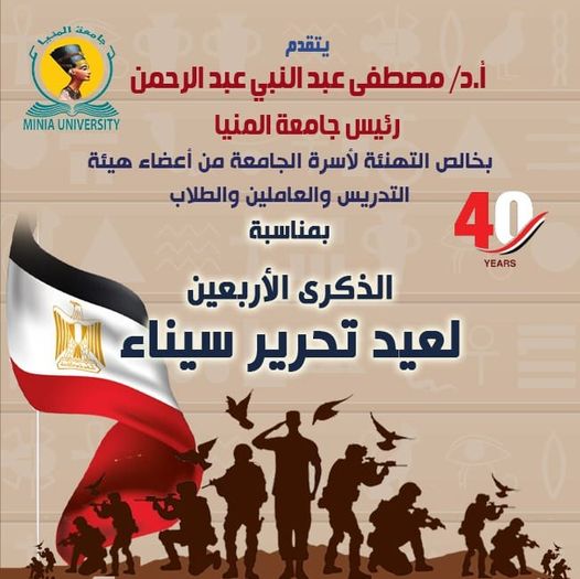أرسل الدكتور مصطفي عبد النبي عبد الرحمن رئيس جامعة المنيا، نيابة عن نفسه وأسرة جامعة المنيا، برقية تهنئة للسيد الرئيس عبد الفتاح السيسي رئيس الجمهورية، قدم فيها التهنئة عن ذكري تحرير سيناء، أرض الأمن والسلام، وهذا الجزء الغالي من أرض الوطن الذي قامت القوات المسلحة الباسلة بتحريره واسترداد كامل أراضيه.