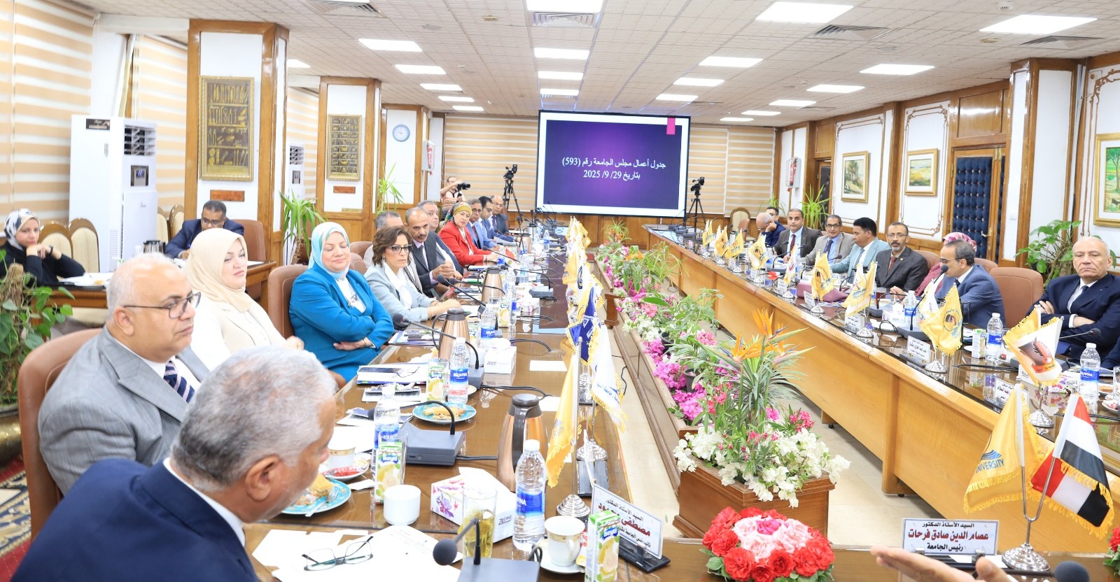واستهل المجلس أعماله بتوجيه د. عصام فرحات التهنئة والشكر لكليات الجامعة بمناسبة بدء العام الدراسي الجديد، مثمناً ما بُذل من جهود لضمان انتظام العملية التعليمية، وسلاسة إجراءات الكشف الطبي للطلاب المستجدين، وحسن استقبالهم داخل الحرم الجامعي وبكلياتهم، بما يتركه ذلك من انطباع إيجابي، يعزز ثقة الطلاب واطمئنانهم لاهتمام الجامعة بأبنائها، بوصفهم محور العملية التعليمية.