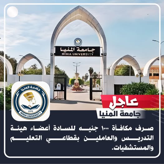 صرف مكافأه ١٠٠٠ جنية للسادة أعضاء هيئة التدريس والعاملين بقطاع التعليم والمستشفيات بجامعة المنيا