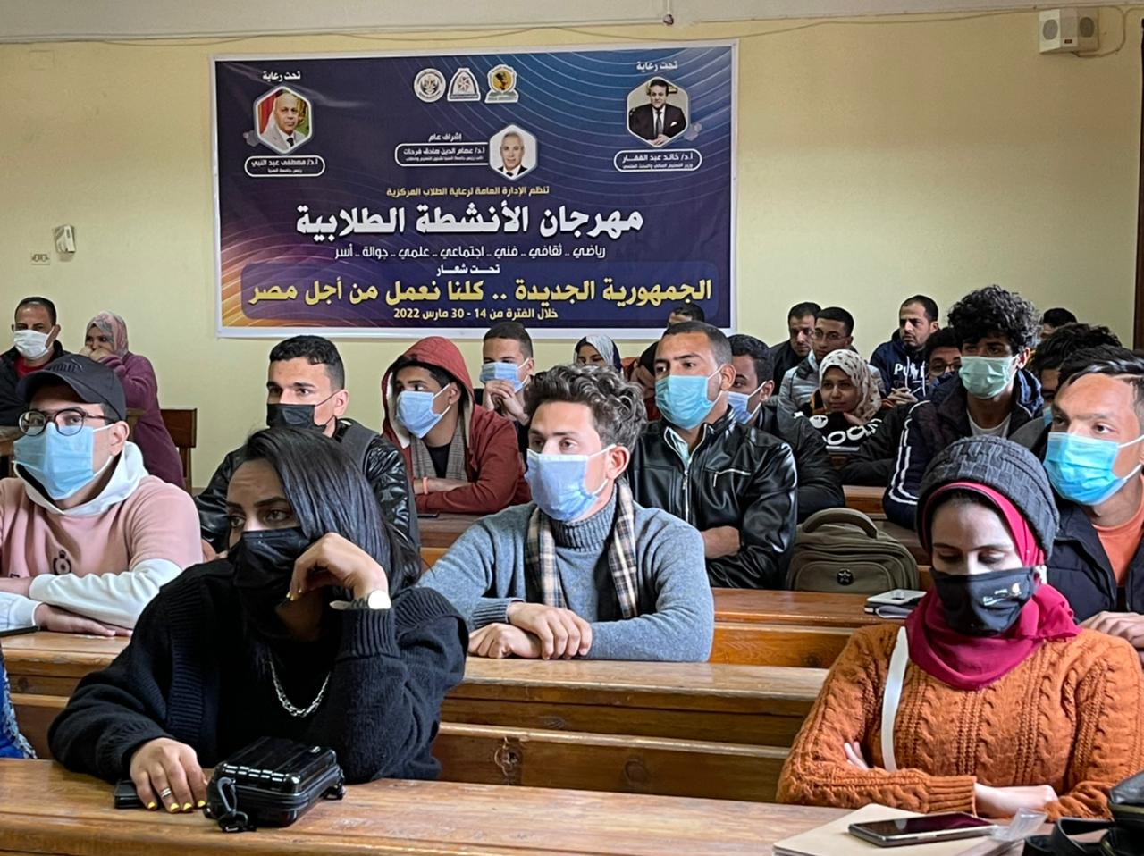 أشاد الدكتور مصطفى عبد النبي، بالإقبال الكثيف من الطلاب للمشاركة بالفعاليات التي تقدمها الكليات ضمن مهرجان الأنشطة الطلابية في المجالات: الرياضية، والثقافية، والفنية، والعلمية، والاجتماعية، والجوالة والخدمة العامة، والاتحادات الطلابية والأسر، والتي بدأت منذ اليوم الأول بمسابقات ومنافسات رياضية عقدتها الكليات بألعاب تنس الطاولة، والرميات الحرة، ومسابقات العدو، وخماسي القدم، وضربات إرسال كرة طائرة، وألعاب القوى، وكرة السلة، ومصارعة الزراعين، كما عقدت الكليات ندوات شعرية، ومسابقات للقرآن الكريم، والشطرنج، وحملات للتبرع بالدم، بالإضافة إلى تنظيم مسابقة لاكتشاف المواهب، كما أقامت كليات التربية الفنية والسياحة والفنادق والصيدلة معارض فنية لطلابها على هامش منافسات المهرجان شملت أعمال طباعة، ولوحات التصوير الزيتي، والفوتوغرافي، والنحت، وبعض المشغولات اليدوية.