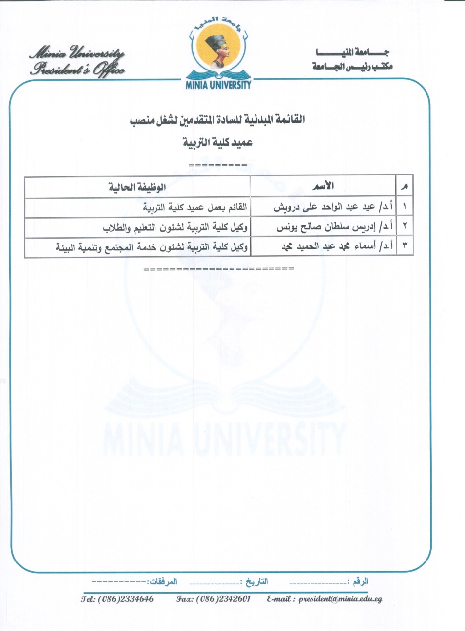 القائمة المبدئية للسادة المتقدمين لشغل منصب عميد كلية التربية