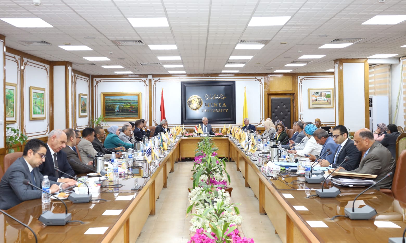 عقد مجلس جامعة المنيا اجتماعه الدوري برئاسة الدكتور عصام فرحات، رئيس الجامعة، وبحضور الدكتور أيمن حسانين نائب رئيس الجامعة لشئون خدمة المجتمع وتنمية البيئة، والدكتور مصطفى محمود نائب رئيس الجامعة لشئون التعليم والطلاب، وعمداء الكليات، ومدير مركز ضمان الجودة والاعتماد، والمدير التنفيذي للمعلومات، والمستشار القانوني، وأمين عام الجامعة؛ وذلك لمناقشة عدد من الملفات الاستراتيجية والقرارات الداعمة لمسار الجامعة نحو التميز الأكاديمي والريادة المؤسسية.