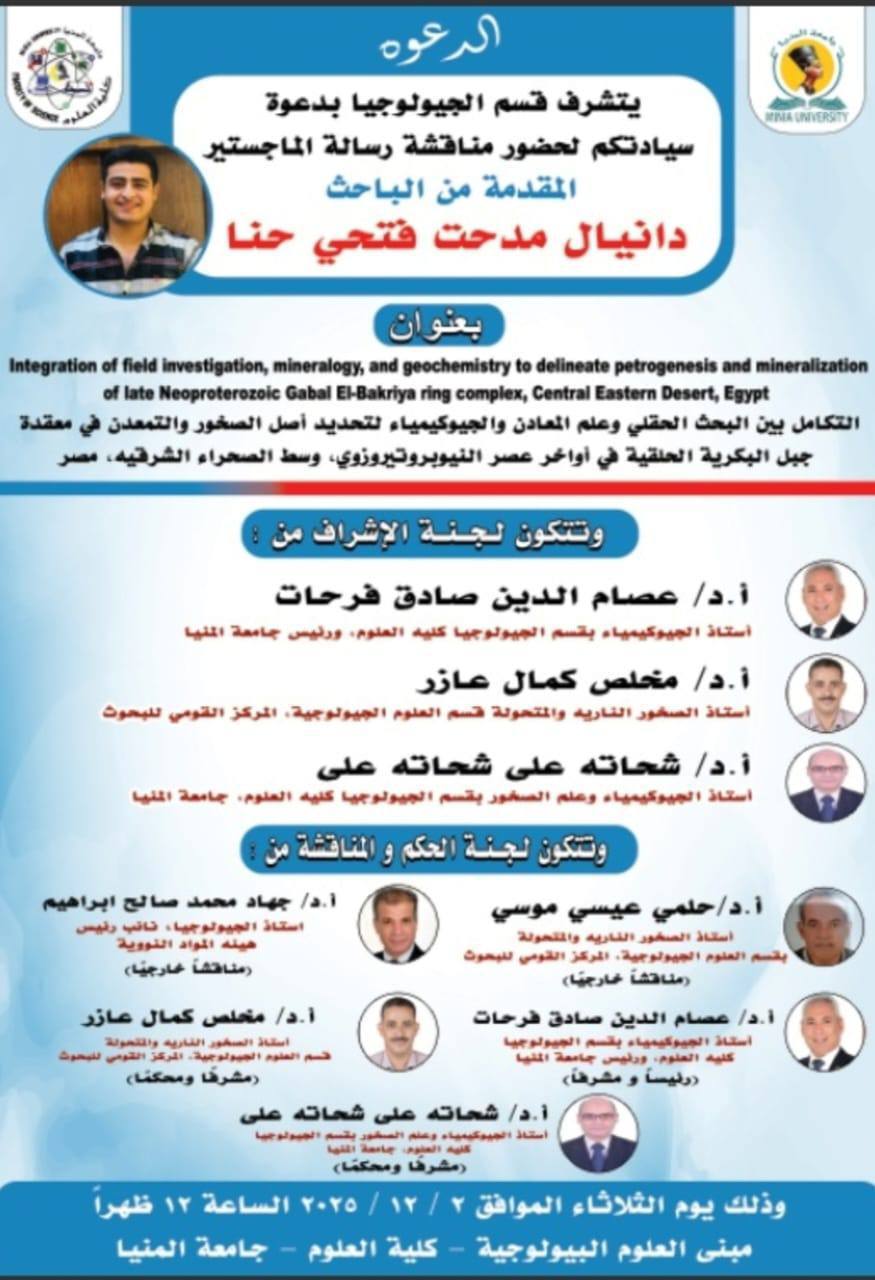 ترأس الدكتور عصام الدين صادق فرحات، رئيس جامعة المنيا وأستاذ الجيوكيمياء بقسم الجيولوجيا بكلية العلوم، لجنة الحكم والمناقشة على رسالة الماجستير المقدمة من الباحث دانيال مدحت في علوم المعادن والجيوكيمياء، تحت عنوان: التكامل بين البحث الحقلي وعلم المعادن والجيوكيمياء لتحديد أصل الصخور والتمعدن في معقدة جبل البكرية الحلقية في أواخر عصر النيوبروتيروزوي، وسط الصحراء الشرقية، مصر.