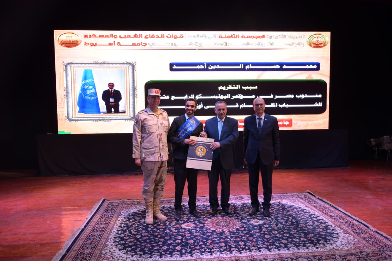 وفي ختام الندوة، جرى تكريم الطالب محمد حسام الدين أحمد، الطالب بكلية العلوم جامعة المنيا، مندوب مصر في مؤتمر اليونسكو الرابع عشر ممثلًا عن الشباب بدولة أوزبكستان، والطالب محمد جمال، من ذوي الهمم، والحاصل على الميدالية الذهبية في ملتقى الإسكندرية لذوي الإعاقة، إلى جانب تبادل الدروع بين الجهات المشاركة، وتكريم عدد من أسر الشهداء وذوي الهمم، تقديرًا لعطائهم ودورهم الوطني.