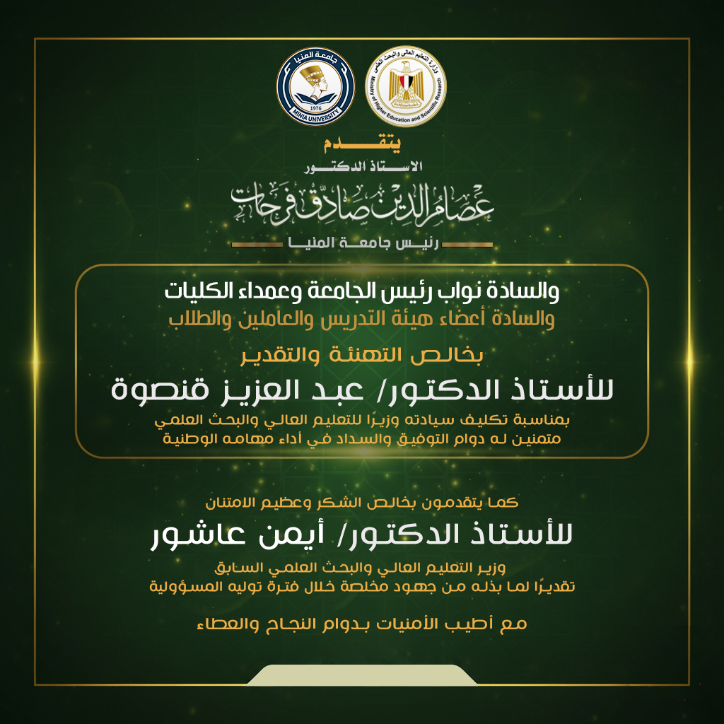 رئيس جامعة المنيا الاستاذ الدكتورعصام فرحات يهنئ الاستاذ الدكتور عبدالعزيز قنصوة لتوليه منصب وزير التعليم العالي