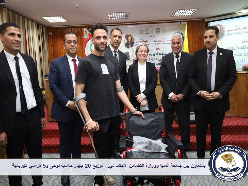 بالتعاون بين جامعة المنيا ووزارة التضامن الاجتماعي.. توزيع 20 جهاز حاسب لوحى و5 كراسي كهربائية لطلابها ذوي الإعاقة