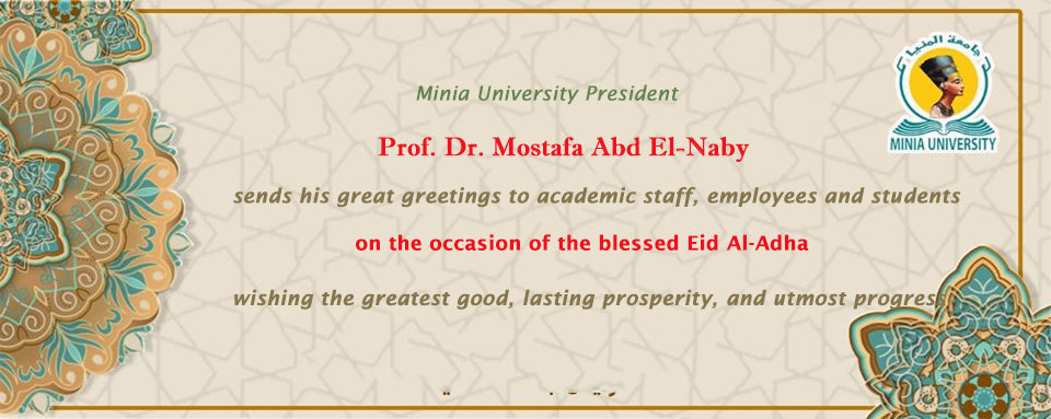 Minia University President Prof. Dr. Mostafa Abd El-Naby sends his great greetings to academic staff, employees and students on the occasion of the blessed Eid Al-Adha, wishing the greatest good, lasting prosperity, and utmost progress