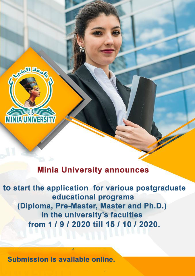 Minia University announces to start the application for various postgraduate educational programs (Diploma, Pre-Master, Master and Ph.D.) in the university’s faculties from 1 / 9 / 2020 till 15 / 10 / 2020. Submission is available online.