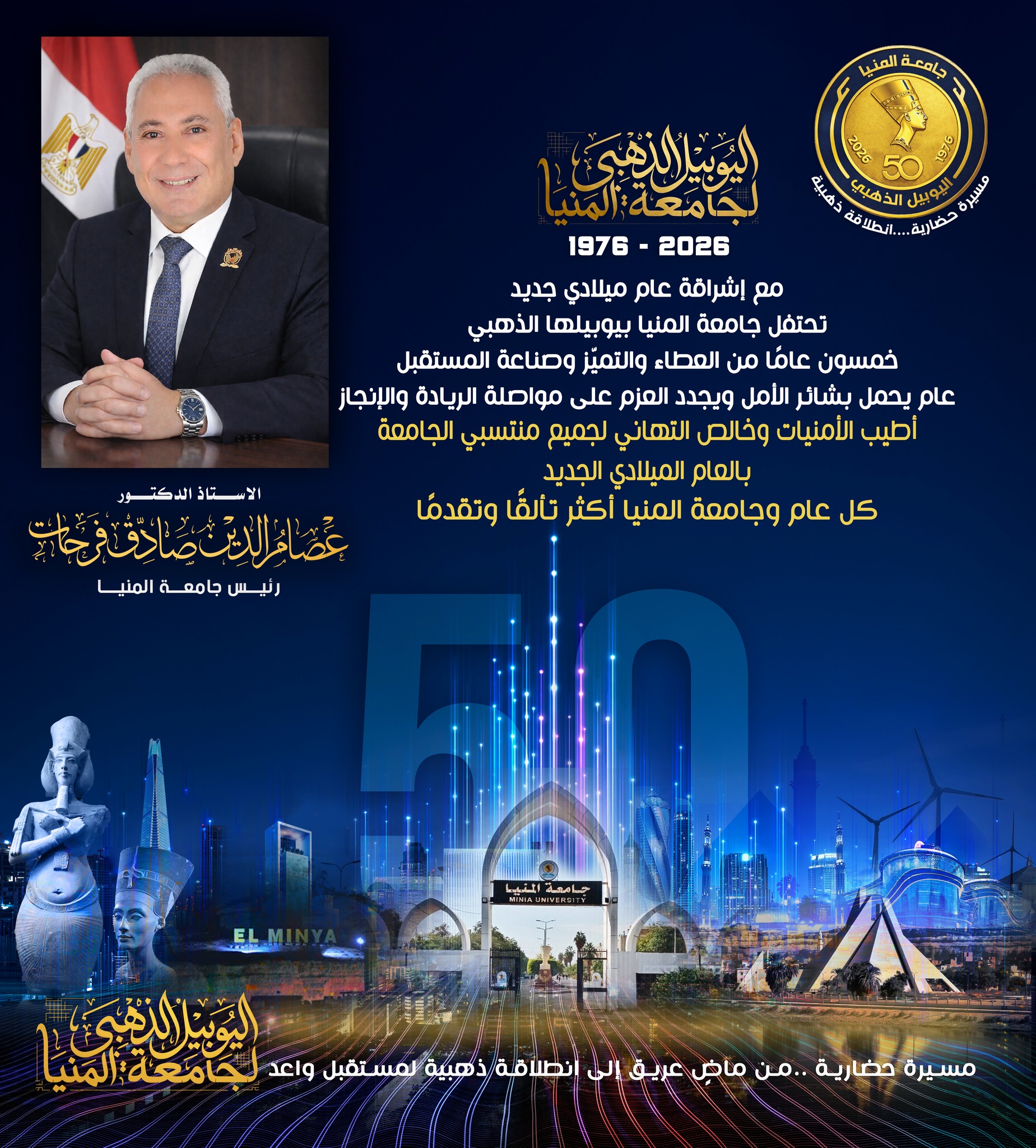 مع إشراقة عام ميلادي جديد تحتفل جامعة المنيا بيوبيلها الذهبي خمسون عامًا من العطاء والتميّز وصناعة المستقبل